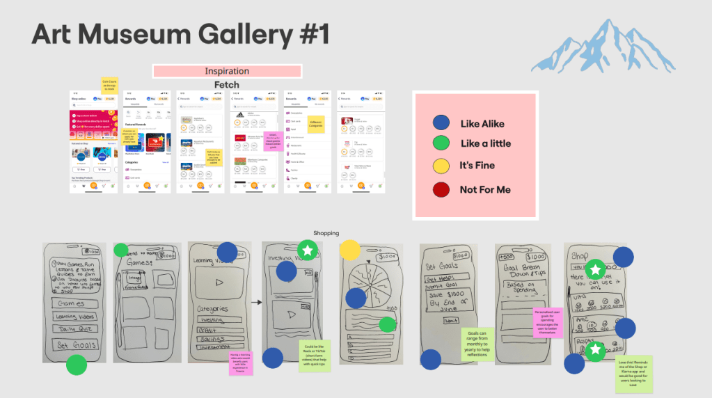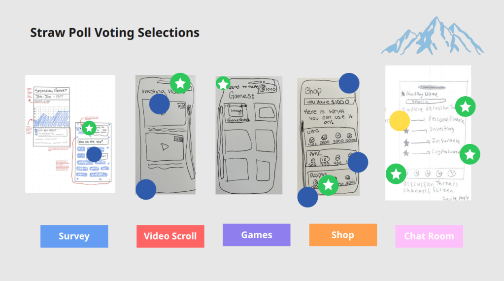 Next the Blue Team kicked off the Straw Pole voting process! This narrows down the app features even further by picking the most popular picks from the Heat Map vote and placing one green/white star dot on our favorite sketches and ideas. Our findings and results came out to be the intro survey, interactive games, video scrolling/tutorials, a shop, and chat rooms! Through a deeper understanding of the user, surveys are a clever, quick, and useful tool to significantly improve both initial impressions and long-term success. Any program can benefit from video scrolling as it’s quick, entertaining, customizable, addictive, and simple to use. It makes use of the psychology of reward, validation, and curiosity. Learning is slipped into games so that it feels like play. They capture interest, foster emotional engagement, and establish a secure environment for trying, failing, and growing. They are therefore perfect for imparting knowledge to a younger audience, such as Gen Z. Earning points for discounts at popular stores and activities like going to the movies makes managing money feel enjoyable, practical, and gratifying. It’s a stepping stone to greater financial understanding. Instructing Generation Z on smart spending, strategic saving, and how to make money work for them. Financial literacy becomes a communal experience in chat rooms. They make learning safe, social, and encouraging. Gen Z is a perfect match for this since they favor community over solitude and collaboration over lectures.