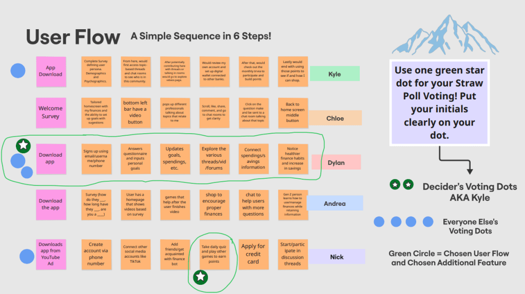 accounts like TikTok, add friends/get acquainted with finance bot, take daily quiz and play other games to earn points, applies for credit card, and start/participating in discussion threads. Kyle was our decider for this exercise, the one who makes the final say for the user flow. The decider gets green circle/white star voting dots while the rest of the team gets blue ones. We ultimately went with Dylan’s user flow being the most fitting for the majority of Gen Z to follow!