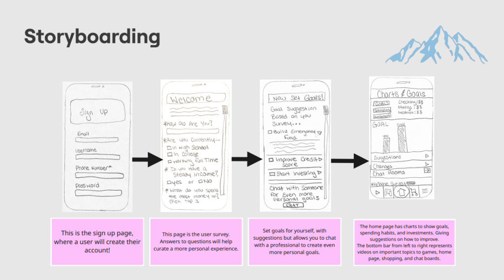Finally, storyboarding is the process of creating a step-by-step visual plan that outlines what your prototype will look like and how a user will interact with it. I made my own sample storyboard before my team meeting to get an idea of what exactly it’s supposed to be, using various sketches that we drew up from the previous exercise. It’s actually just piggybacking off of the user flow portion of phase 2 of the sprint! Since Dylan’s user flow was chosen, Chloe then modeled the new sketches for the storyboard off of that path! Users would start with the signup page, then the survey, followed by a consultation with a professional in finance to help set goals for themselves, and finally the home page, where the app shows their current goals, spending habits, and investments.