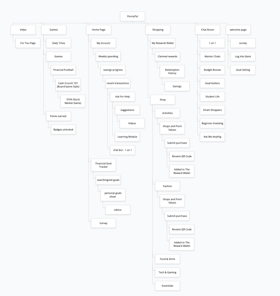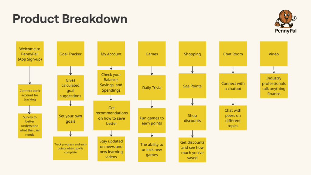 We started with the product breakdown, where we took all of the different avenues that PennyPal offers to its users and create a mini timeline for each one to explain how they’d each be used. These avenues could be anything from the signup process, to the games and shopping, or the users account settings. For each avenue, we included a thorough explanation of the purpose they serve in the app and how they’ll benefit the target audience, which is Gen Z. For example, the video feature explanation is as follows: 15-60 second video format is perfect for short attention spans. Gen Z grew up with high-speed internet and instant gratification. This will satisfy that while providing education at the same time.