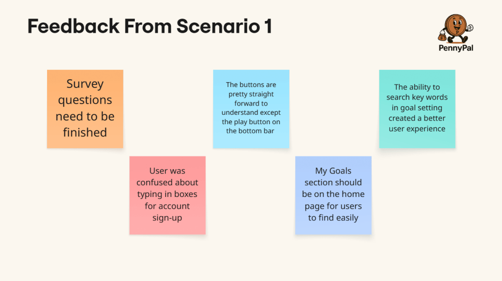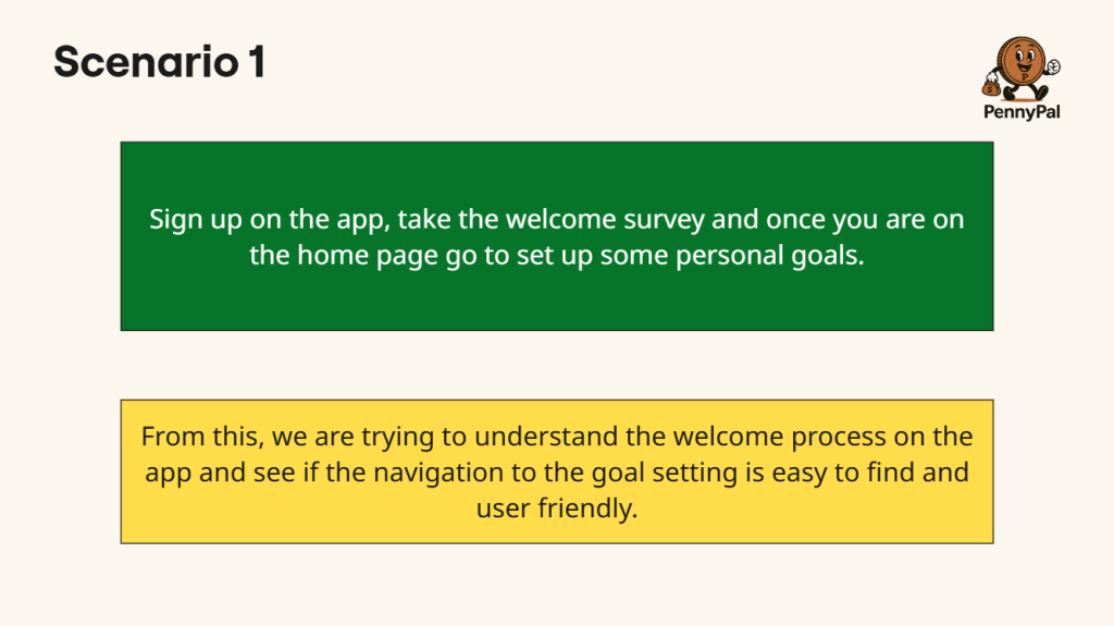 Prior to testing with real users, the User Testing Simulation is a trial run of your usability test. It helps find and resolve any problems with your prototype, test script, or configuration, making sure that the actual test runs without a hitch and provides valuable input. The sprint team creates a scenario, they identify the goal of the scenario, and proceed to gain user feedback to see what they can improve on. The scenario shown below is about when a new user opens the app for the first time and is beginning the sign-up process! The feedback works out any kinks and smooths out any bumps in the road to make the experience more user friendly, as the goal aims to do.