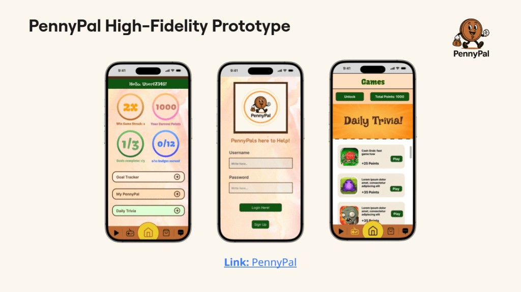 The next step in our prototyping process was to create an app map and the wireframing to go along with it! An app map is a visual representation of its architecture, showing the links between its elements, such as functions, classes, files, and services. It is frequently used to comprehend and evaluate the application’s architecture and behavior. The wireframe portion of this next step is when we take our previous sketches from each avenue of our prototype and showing what screen comes first, second, and last. One of them, for example, would go from the home page, the users account, and their goal tracker tab. A low fidelity and high fidelity prototype can then be created, with the former in particular being a rough, early version of a sprint teams product that is mainly used for testing ideas and gaining user feedback before the latter, the high fidelity prototype, is birthed. Our team is full of talented people who created the design for the high fidelity prototype to bring PennyPal to life!